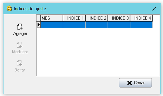 Desde el menú seleccionamos (Contabilidad > Indices de Ajuste) y se nos presenta el siguiente cuadro: