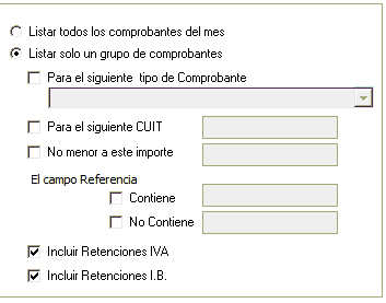 Haga click sobre la pestaña "Registros a listar" y pasará a la pantalla de definición de registros a listar (o definición de filtro). Aquí debemos definir un conjunto de condiciones que deben cumplir los registros (en este caso comprobantes de compra) para ser incluidos en el listado. Basicamente cada linea definirá una condición