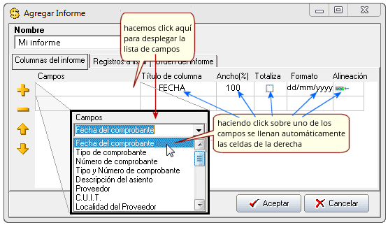 Inicialmente tenemos seleccionada la pestaña "Columnas del Informe" que es donde definiremos las columnas que queremos que tenga el informe. Para cada columna podremos definir el "Campo", el "Título", el "Ancho(%)" decidir si tendá un totalizador al pie de la columna "Totaliza", establecer el "Formato" con el que se mostrará y la "Alineación" que tendrá. Haga click sobre la primer celda de la columna "Campos" y se desplegará una lista de campos, elija uno haciendo click sobre la lista y verá como las columnas de la derecha se llenan automáticamente.
